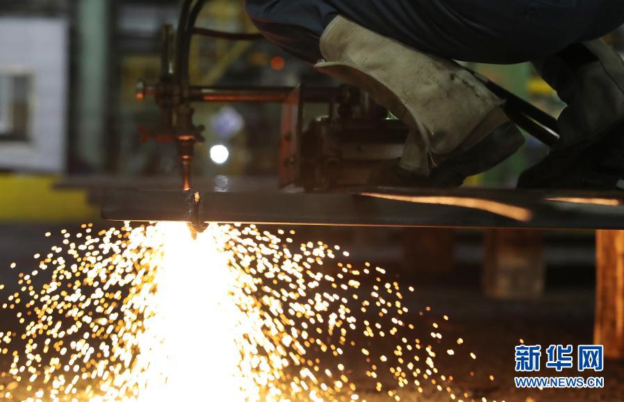 赵小龙使用半自动切割小车进行钢板切割作业(1月28日摄)。新华社记者 方喆 摄
