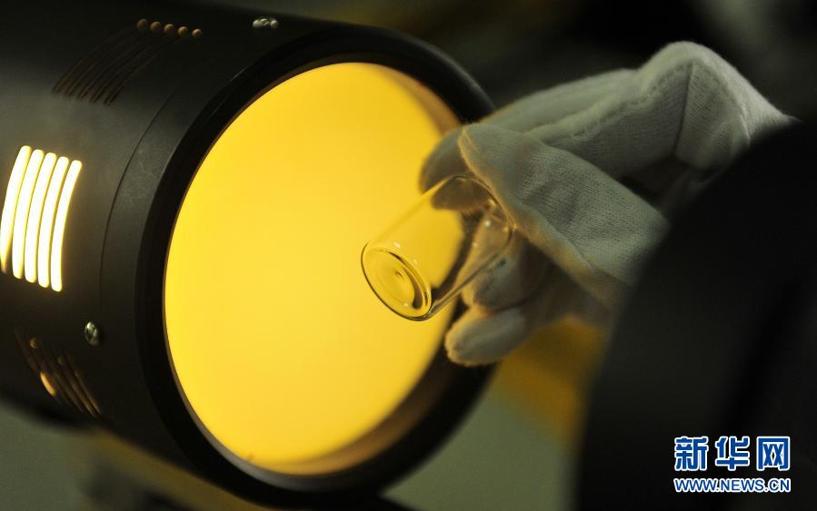 2月6日,工人在位于沧县纸房头工业园区的沧州四星玻璃股份有限公司药用中性硼硅玻璃管制瓶车间对新下线药包玻璃产品做应力检测。