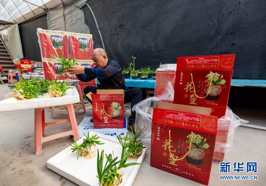 2月6日,在福建省漳州市高新区九湖镇百花村,花店店主打包水仙花。