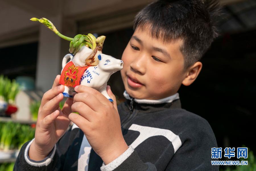 2月6日,在福建省漳州市高新区九湖镇百花村,小朋友在观看牛年元素的水仙花产品。
