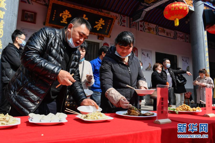 2月6日,在奉化区裘村镇马头村,外来务工人员准备品尝菜肴。