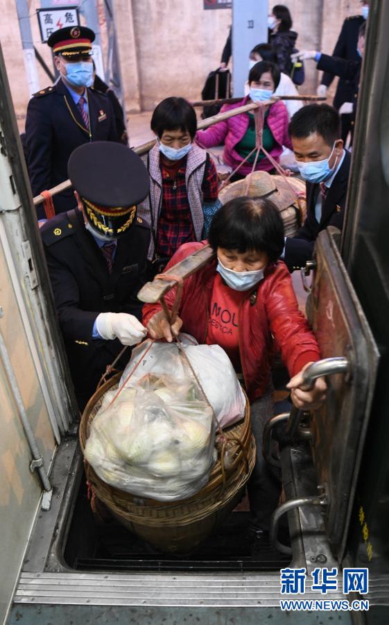 2月5日,在广东省廉江火车站,乘务人员帮助挑担的果农登上5534次列车。