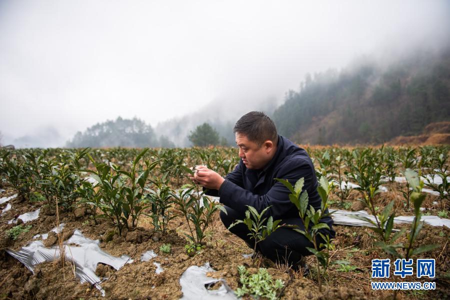 2月4日,在湖南省花垣县民乐镇梳子山村一处茶园,石峰在观察茶叶长势情况。新华社记者 陈思汗 摄