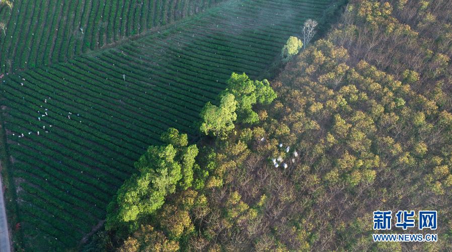 2月7日,茶农在海南省白沙黎族自治县五里路茶叶专业合作社的有机茶园采茶(无人机照片)。