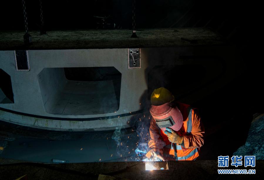 参与新疆天山胜利隧道工程施工的工人在隧道内进行焊接作业(2月3日摄)。