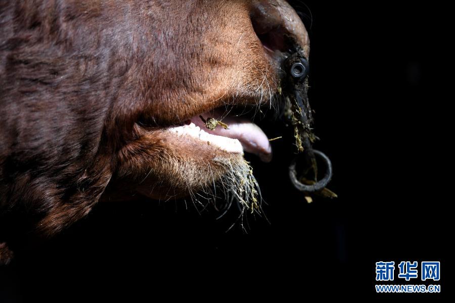 2月5日,国家肉牛改良中心饲养的一头秦川牛肉用新品系种公牛在咀嚼青贮饲料。