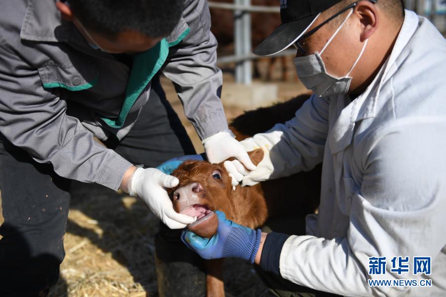 2月5日,西北农林科技大学肉牛科技创新团队成员李炳志(右)和试验区管理人员李建奇检查一头犊牛的成长情况。