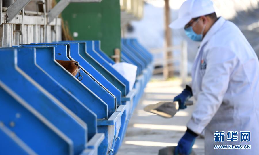 2月5日,工作人员在国家肉牛改良中心给秦川牛配饲料。