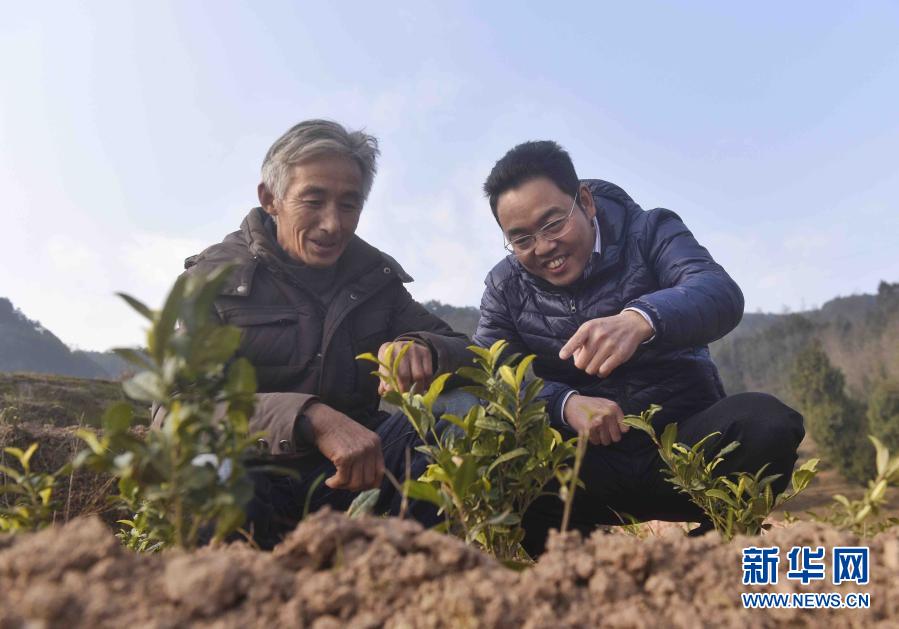 1月25日,李忠伟(右)在四川省巴中市巴州区天马山镇五彩生态体验茶园内向茶农周庆德了解种植情况。新华社记者 刘坤 摄