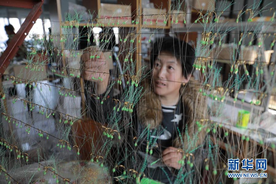 2月5日,在山东省滨州市沾化区下洼镇依娜渔具有限公司,工人在制作鱼钩。