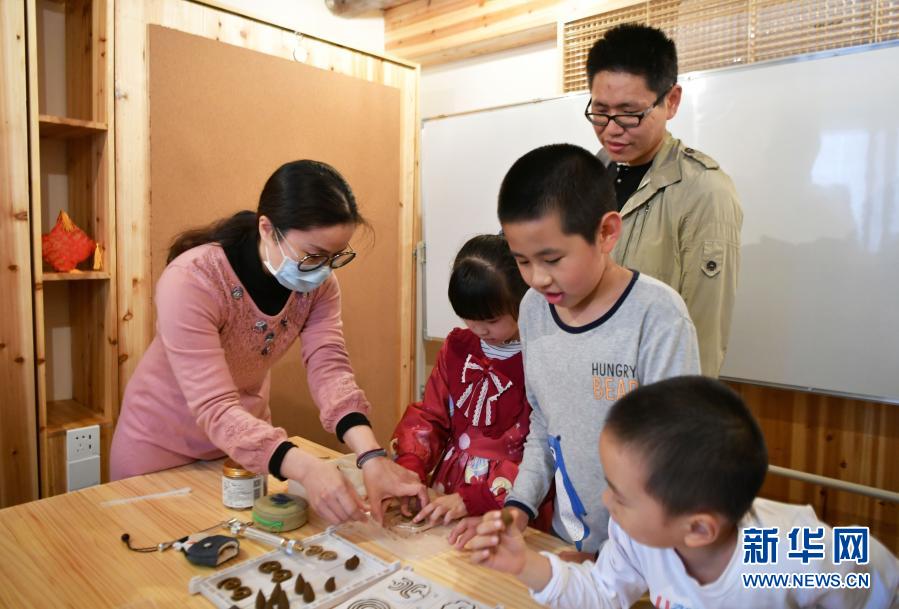 林佳垔(左一)在民宿里为来参观的小朋友介绍捏泥人的步骤(2月6日摄)。新华社记者魏培全摄