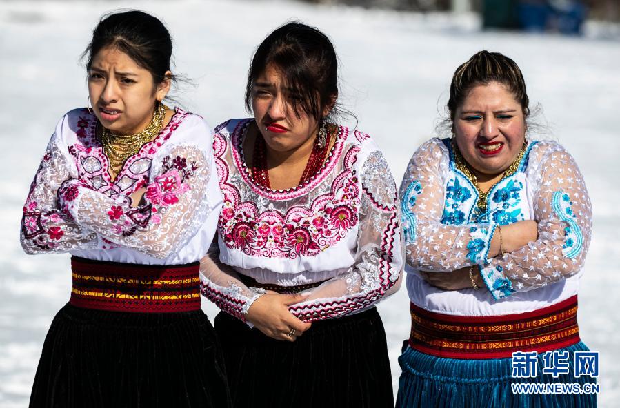 2月7日,在美国芝加哥,录制视频的演员在严寒中瑟瑟发抖。