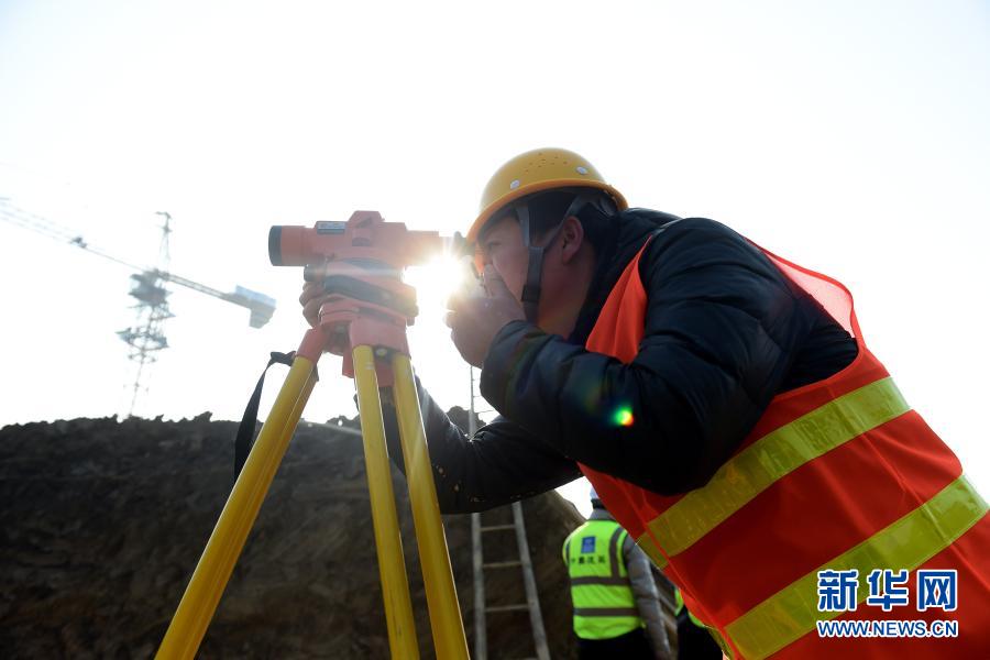 2月4日,张成军在建设项目上操作水准仪。新华社记者 黄博涵 摄