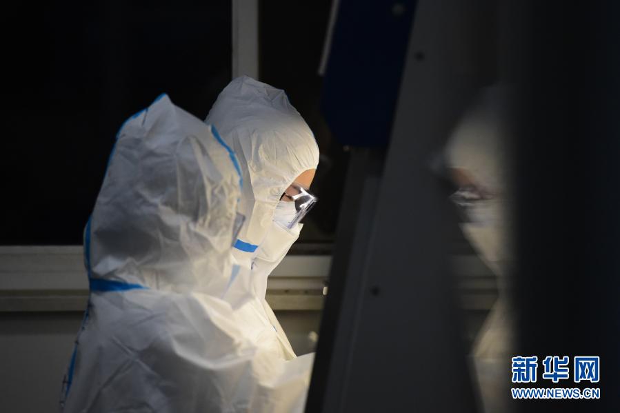 2月2日,柏玉婷(右)在合肥迪安医学检验实验室有限公司的生物安全柜前处理核酸样本。新华社记者 黄博涵 摄