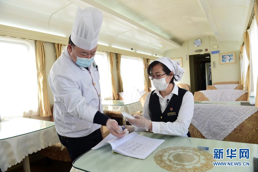 2月3日,施凤荣在K94次列车上为餐车工作人员测量体温。新华社记者 黄博涵 摄