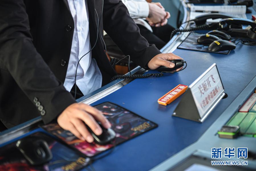 1月28日,在三亚空管站塔台管制室进行管制指挥时,洪源握着耳麦话筒开关,以便随时对外通话。