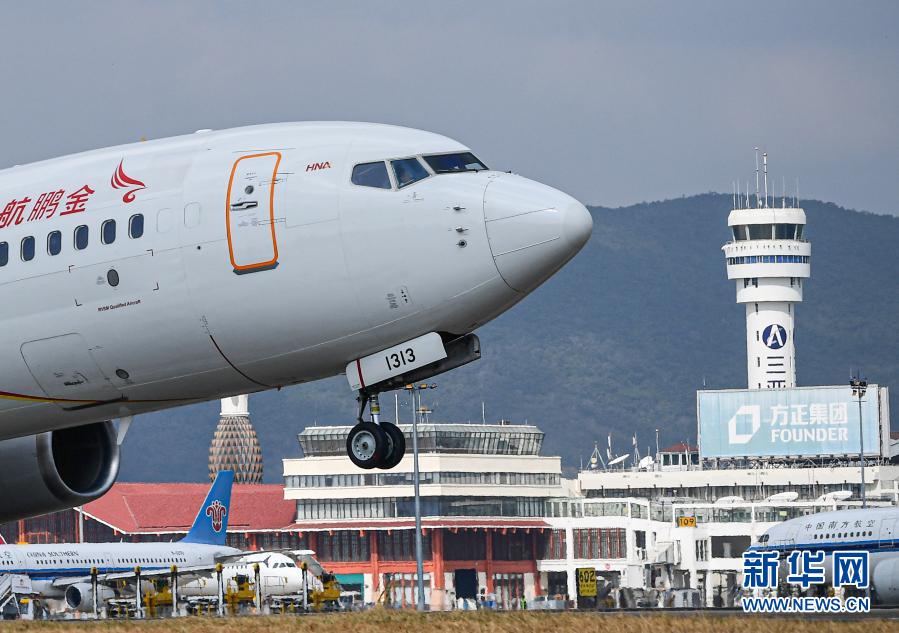 这是1月28日拍摄的一架从三亚凤凰国际机场起飞的民航客机和三亚空管站塔台。新华社记者 蒲晓旭 摄