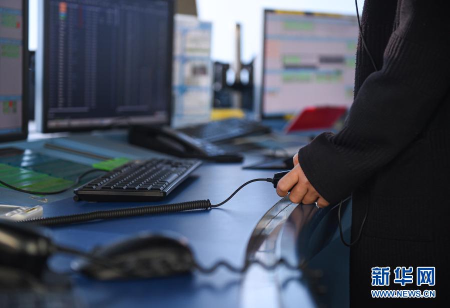 1月28日,在三亚空管站塔台管制室进行管制指挥时,一名塔台管制员握着耳麦话筒开关,以便随时对外通话。新华社记者 蒲晓旭 摄