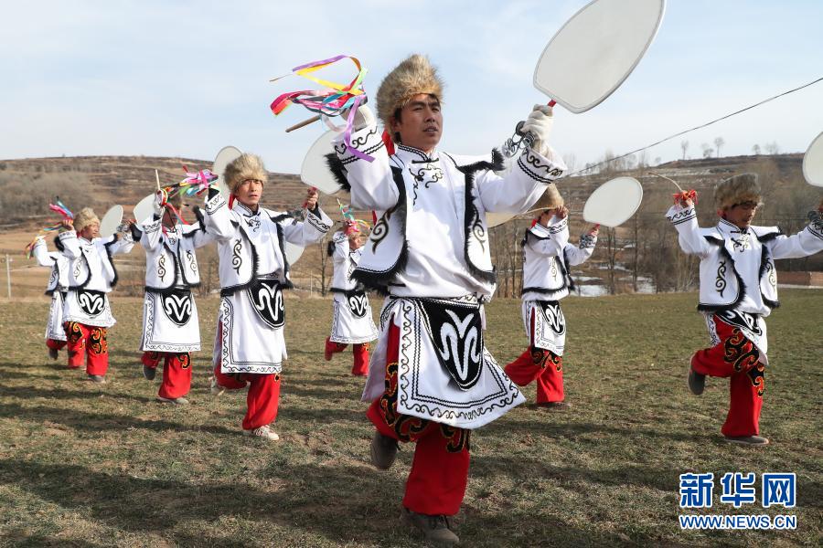 2月7日,渭源县麻家集镇路西村村民在表演羌蕃鼓舞。