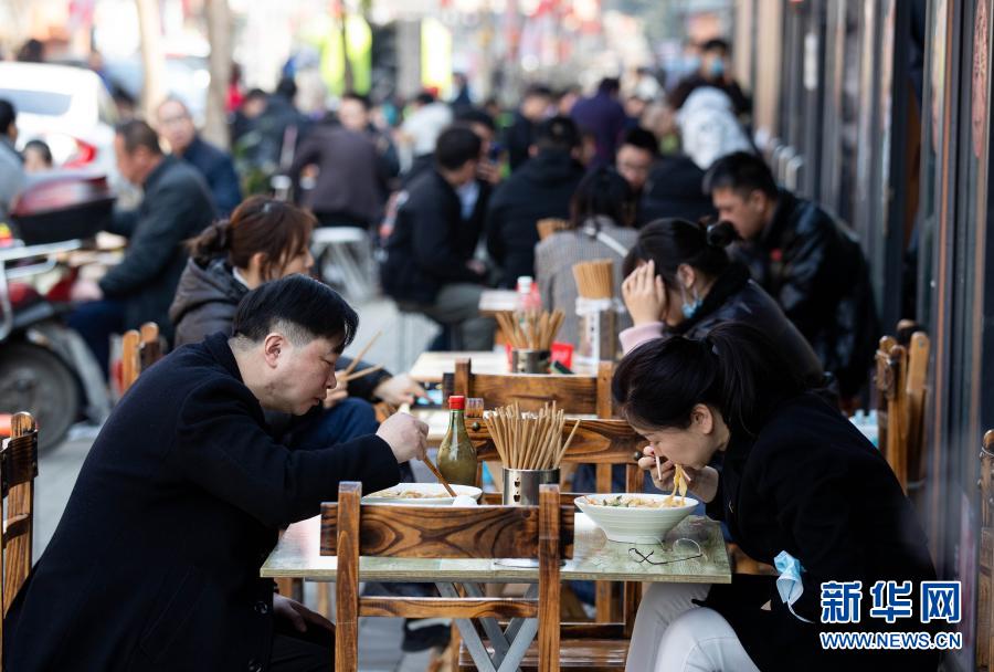2月8日,在成都市老西门面街开街仪式上,成都市民在享受面食。