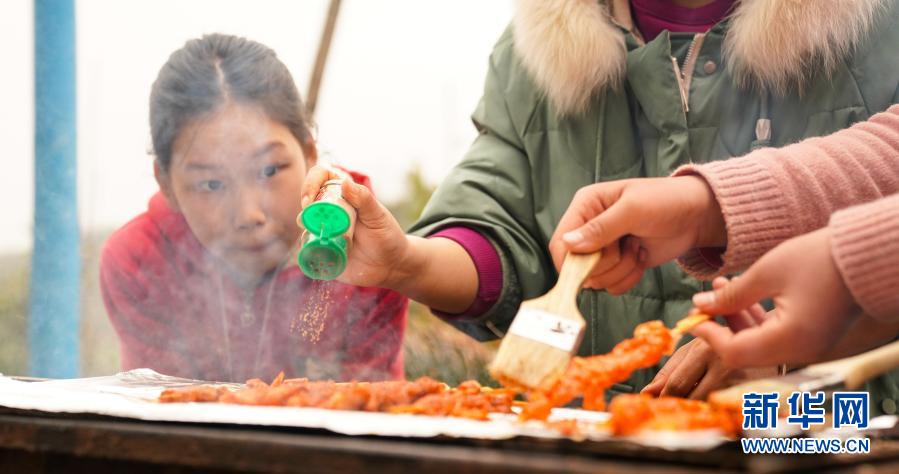 2月3日,竹亭镇中心小学4年级学生李玉春在看大家烤肉。新华社记者 胡晨欢 摄