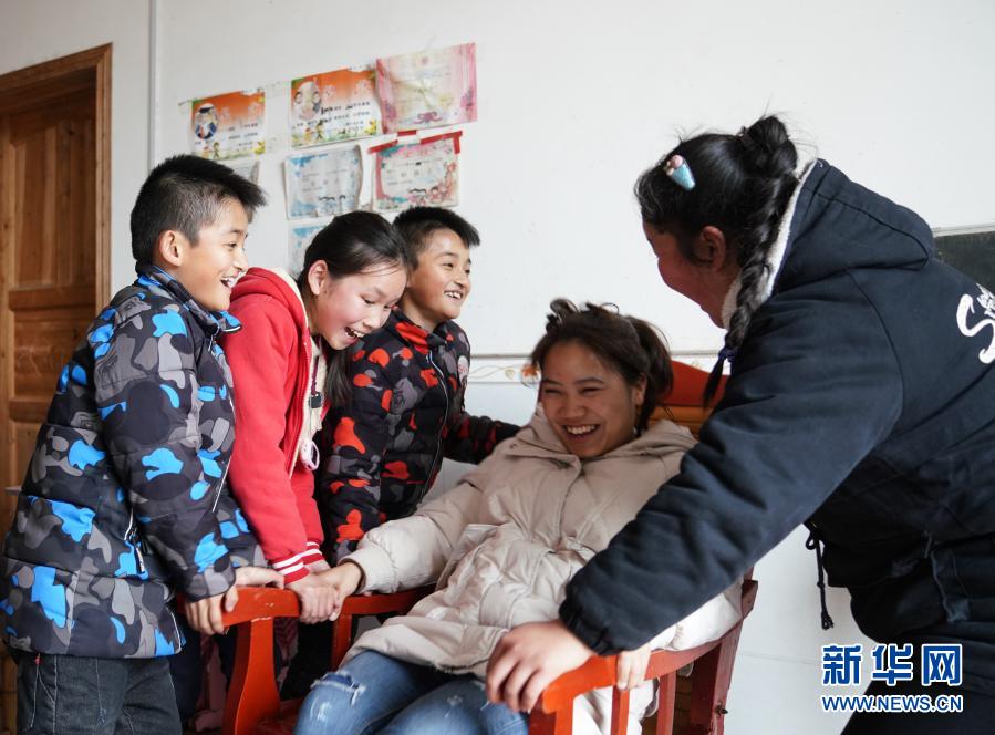 2月4日,王翩(右二)和学生在一起玩“摇摇乐”游戏。新华社记者 胡晨欢 摄