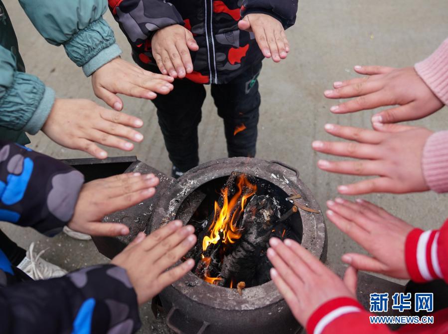2月3日,王翩和学生们一起用炭炉取暖。新华社记者 胡晨欢 摄