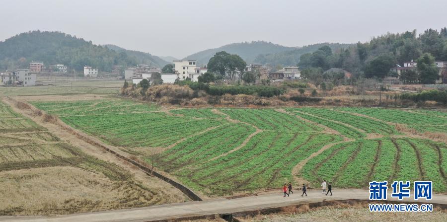 2月4日,王翩和学生们走在竹亭镇庙脊岭村的田间(无人机拍摄)。新华社记者 胡晨欢 摄