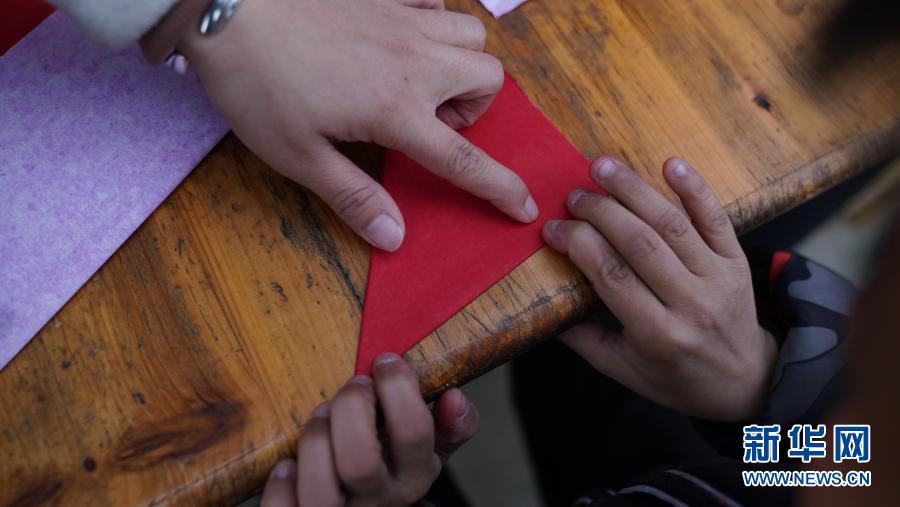 2月4日,王翩(左)和学生们一起剪纸。新华社记者 胡晨欢 摄