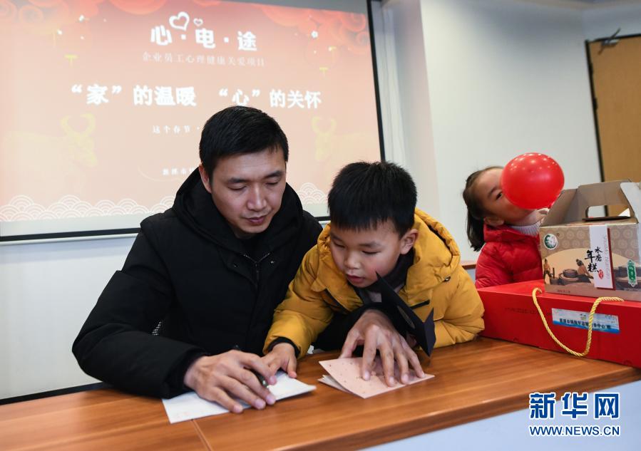 2月8日,留岗员工和子女们一起给家乡亲戚寄礼物,写贺卡。新华社记者 徐昱 摄