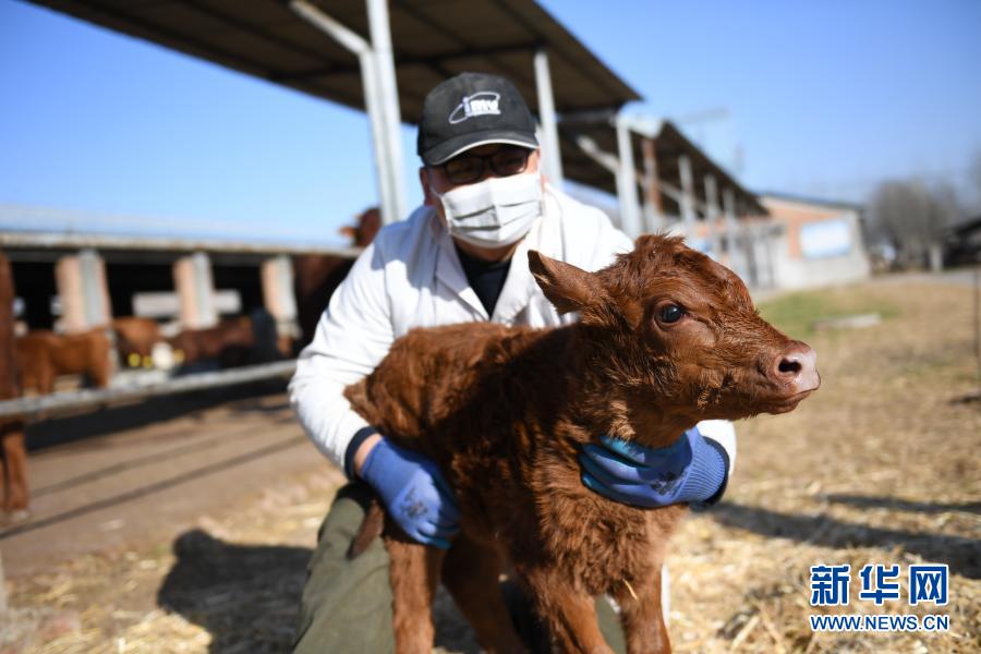 2月5日,西北农林科技大学肉牛科技创新团队成员李炳志在国家肉牛改良中心怀抱一头牛犊。新华社记者 李一博 摄