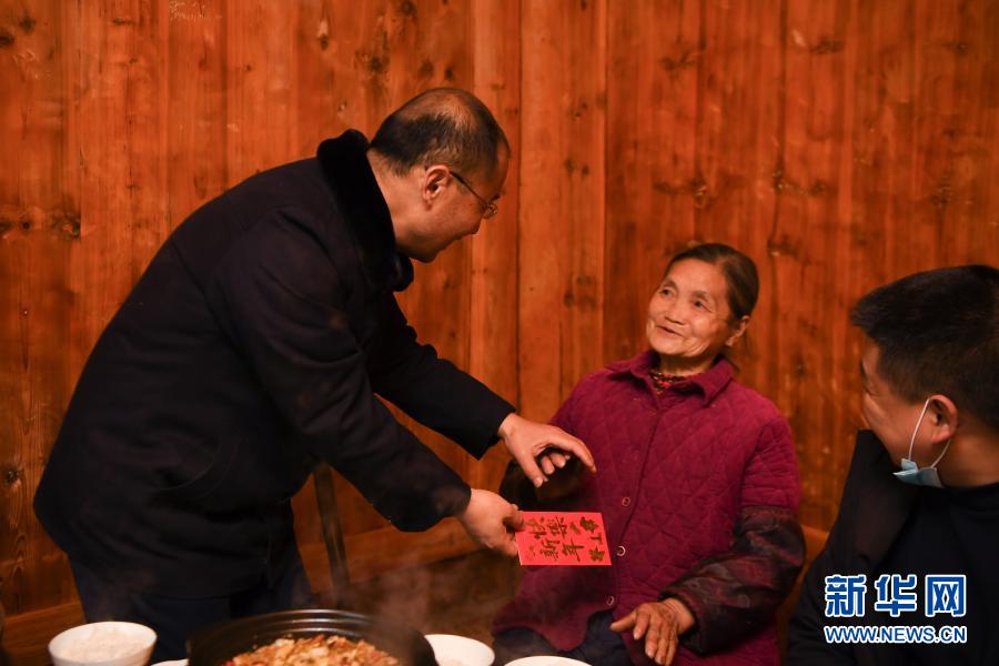2月5日,湖南省常德市石门县金河村扶贫队长、第一书记张忠富(左)在金河村脱贫户邓先鹤家中给邓先鹤的母亲送上拜年红包。新华社记者 薛宇舸 摄