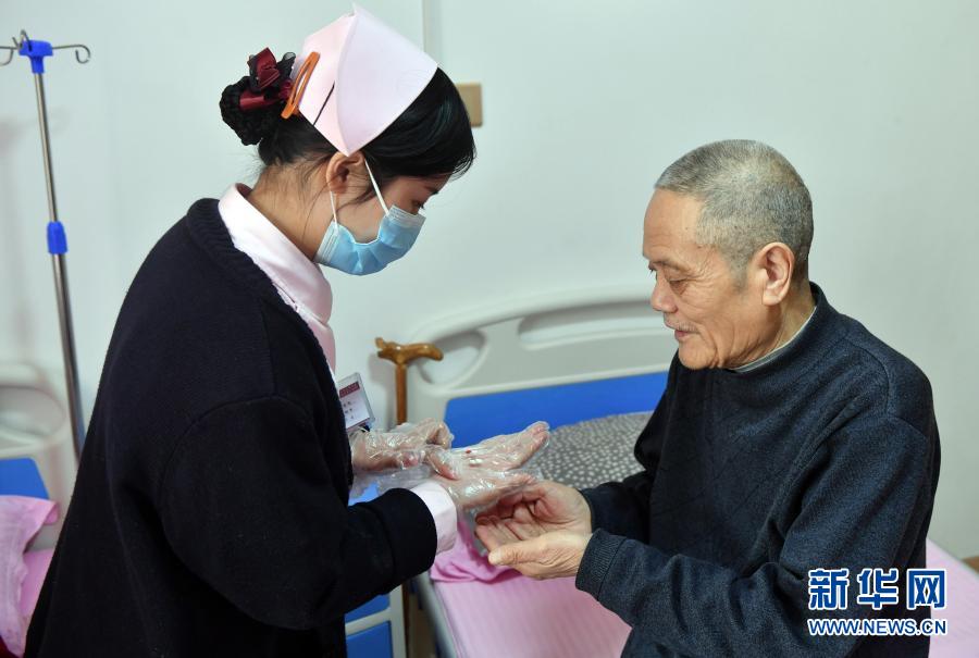 2月8日,在郑州爱睦家护理院,医护人员帮助老人服药。