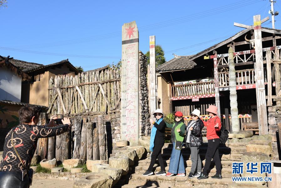 游客在中寨司莫拉佤族村拍照留念(2020年12月30日摄)。新华社记者 林碧锋 摄