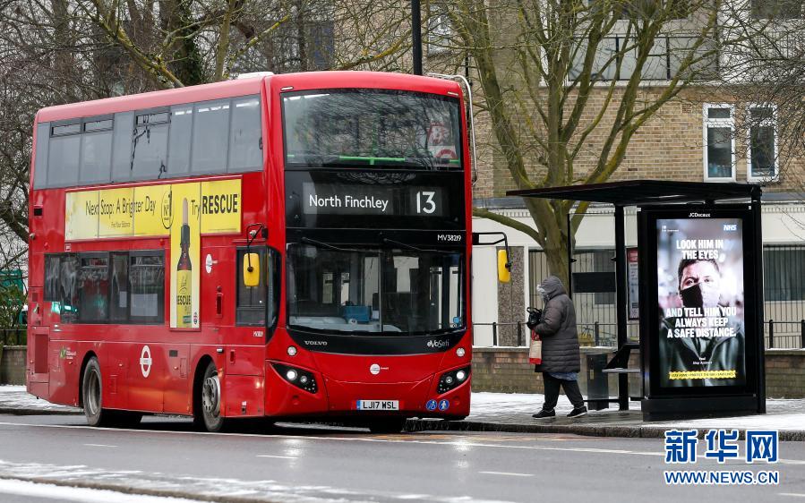 2月8日,一名乘客在英国伦敦准备乘坐一辆公交车,车站的广告牌提示人们保持社交距离。