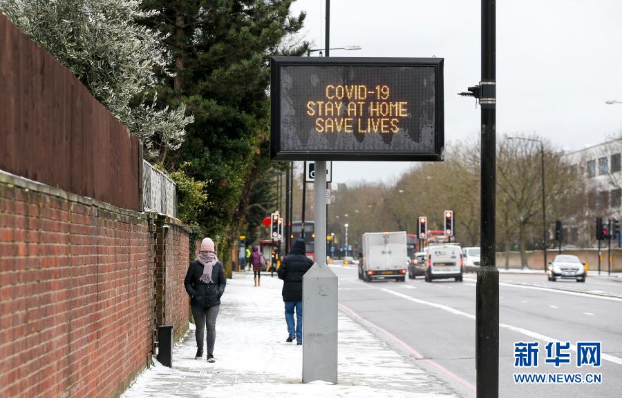2月8日,行人从英国伦敦一处电子屏幕旁走过,屏幕上显示英国疫情防控口号——“留在家中,挽救生命”。