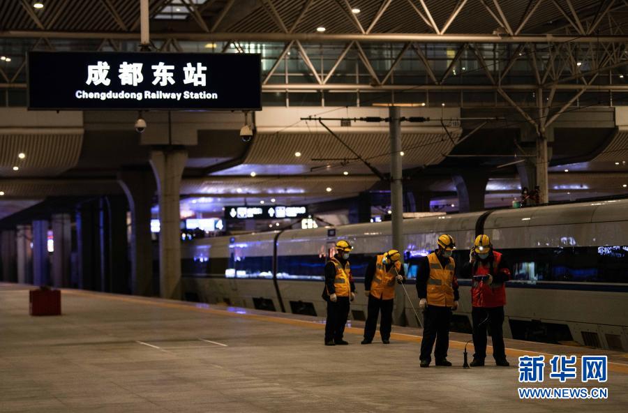 在成都东站,李顺洪(右一)和工友检查站台给水管道(1月24日摄)。新华社记者 王曦 摄