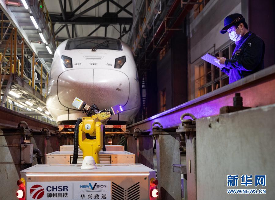 2月2日,在中国铁路成都局集团有限公司成都动车段运用检修库,动车组机械师吴昊在调试智能机器人。