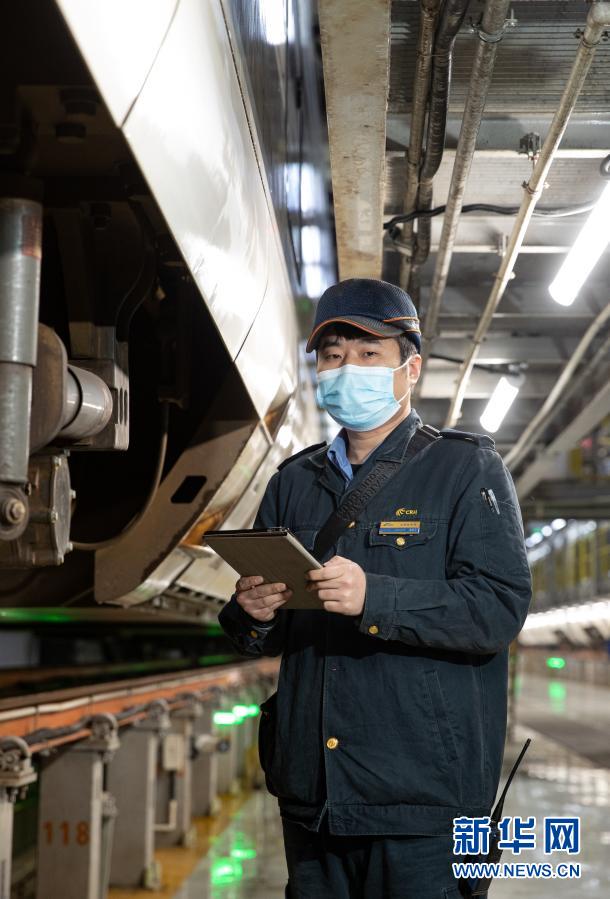 2月2日,动车组机械师吴昊在成都动车段运用检修库留影。