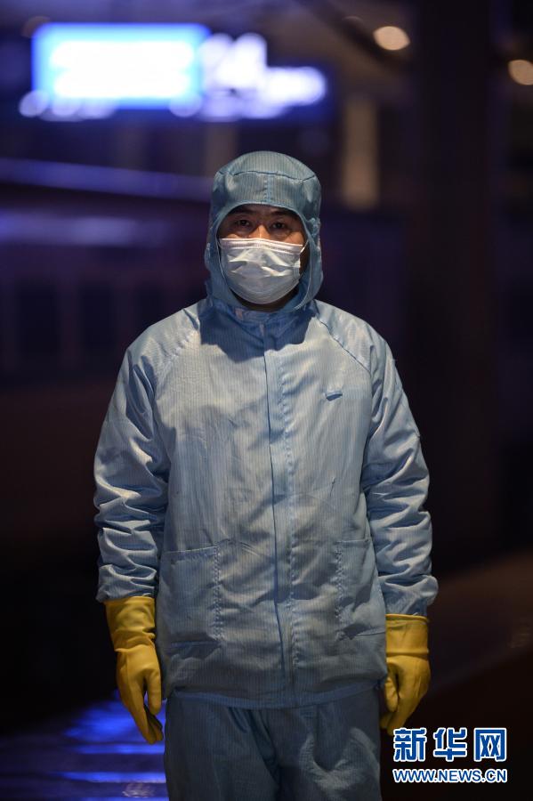 2月2日晚,成都东站消毒组的消毒员李庆文在站台留影。