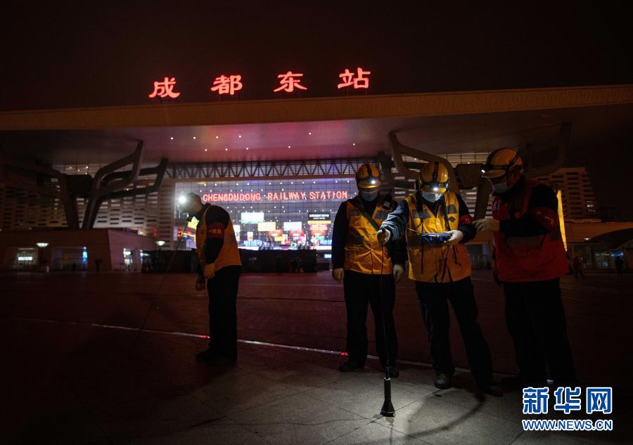 在成都东站,李顺洪(右一)指导工友使用听漏设备检查东站西广场下的给水管道(1月24日摄)。