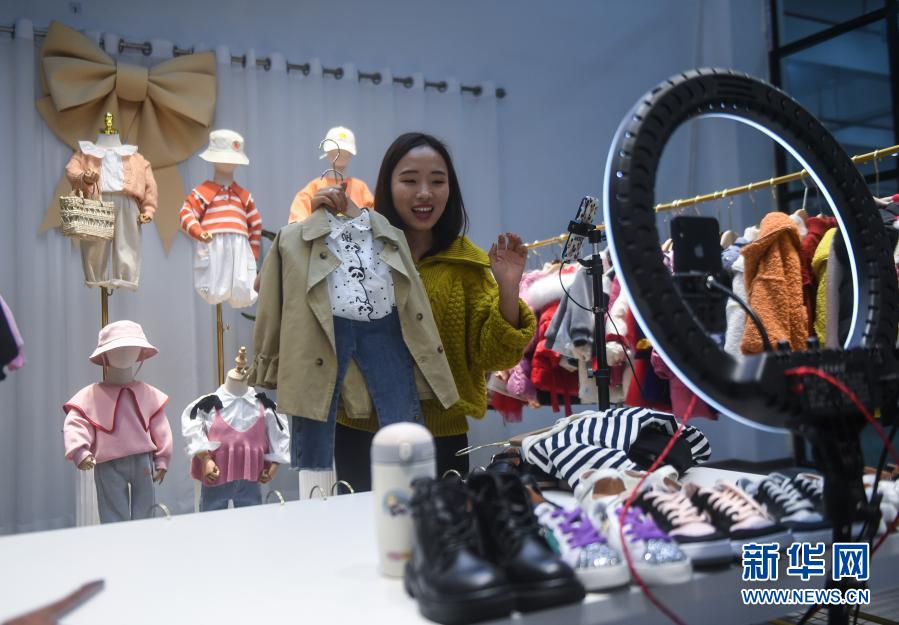 2月8日,织里镇一家童装电商的工作人员在直播销售童装。据了解,该企业现在每天的成交量在300单左右,买家通过直播下单后,货品在24小时内由快递公司员工上门收取后发出。