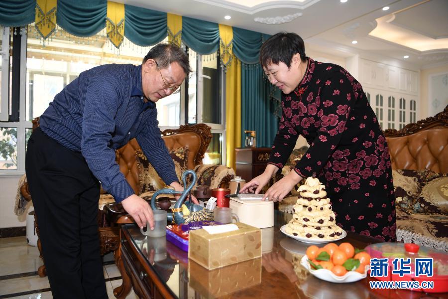 陈志昊的父亲陈国谦(左)和母亲庞丽在山东泰安的老家中打扫卫生(2月8日摄)。