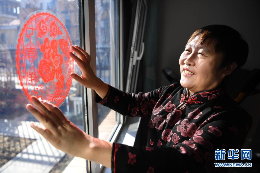 陈志昊的母亲庞丽在山东泰安的老家中贴福字(2月8日摄)。
