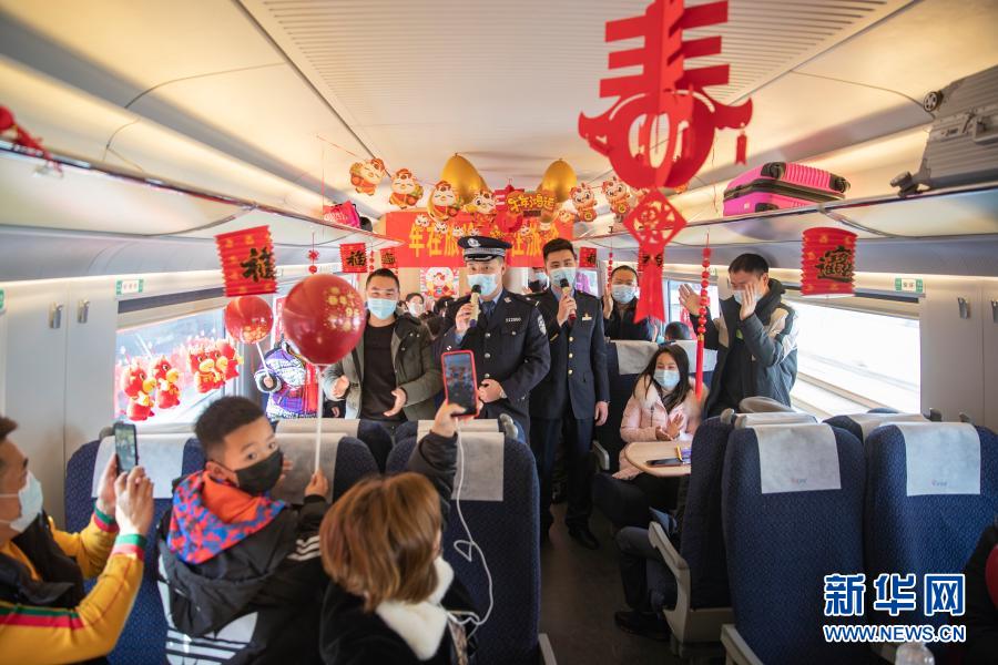 新年临近,中国铁路成都局集团有限公司重庆客运段联合重庆铁路公安处组织青年志愿者,将万州北开往重庆北的C6409次列车装扮一新,为旅客带来一场自编自演的别样“高铁春晚”,让奔波的旅客多了归途的快乐,在旅途中体验别样“年味”。