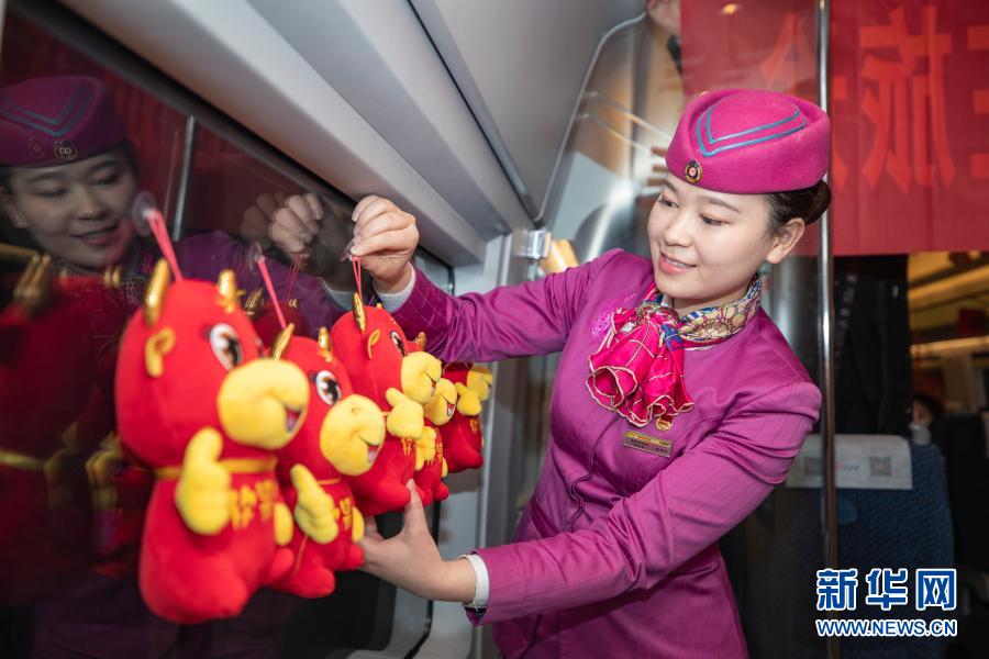 2月9日,在万州北开往重庆北的C6409次列车上,列车员在装扮列车车厢。新华社记者 黄伟 摄