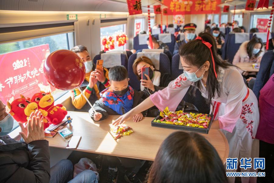 2月9日,在万州北开往重庆北的C6409次列车上,志愿者为旅客发放新年糖果。新华社记者 黄伟 摄