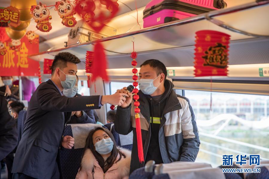 2月9日,在万州北开往重庆北的C6409次列车上,志愿者为旅客进行歌唱表演时与旅客互动。新华社记者 黄伟 摄