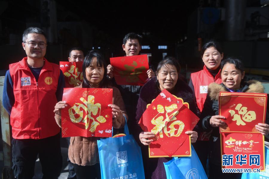 2月9日,在位于织里镇的湖州宏叶铝业有限公司内,织里镇总工会工作人员与留下过年的外地员工合影。新华社记者 徐昱 摄