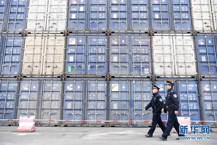 2月8日,民警雷激(右)和同事在重庆团结村中心站货场巡逻。新华社记者 唐奕 摄